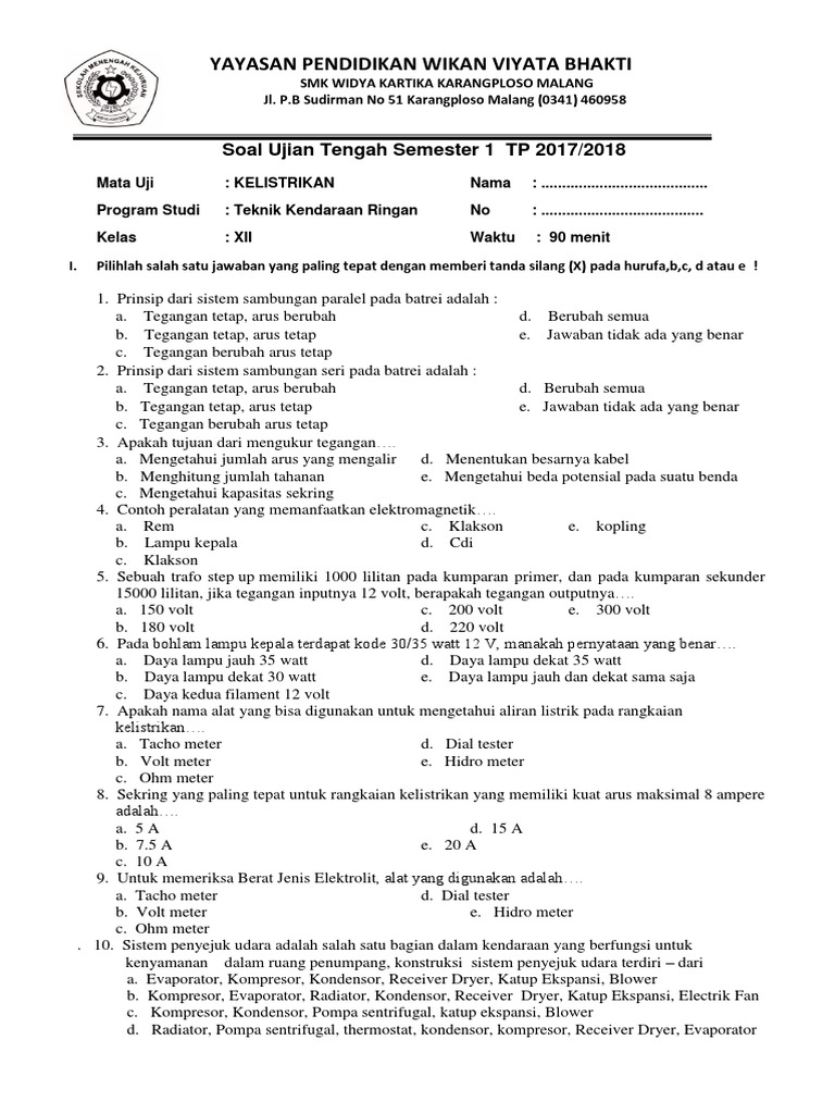 Jawaban atas pemutaran film beth. Enzim tersebut dinamakan dengan … a. Soal pilihan ganda diartikel ini terdapat 363 soal dan 50 soal esay. Soal ini merupakan kumpulan soal listrik otomotif atau pemeliharaan kelistrikan kendaraan ringan (pkkr). Materi kelistrikan kelas 11 smk. Documents similar to contoh rpp smk pemeliharaan kelistrikan kendaraan ringan 11.docx. Makna film beth ditinjau dari kepentingan penonton. Penetapan kriteria ketuntasan minimal per kompetensi kompetensi dasar dan indikator mata pe pelajaran kelas satuan pendidikan. Kerjakan soal pilihan ganda di bawah ini dengan memilih salah satu pilihan jawaban a, b, c, dan e pada kolom yang telah tersedia! Untuk di beberapa tempat, nama tesnya bisa uas semester genap atau semester 2, bisa juga ulangan umum bersama (uub) di. Pemeliharaan kelistrikan kendaraan ringan soal ujian. Walah do njaluk kunci jawaban, genah judule wae soal ngono kok, ora nggowo kunci jawaban. Pemeliharaan sasis dan pemindah tenaga kendaraan ringan smk kls xii.